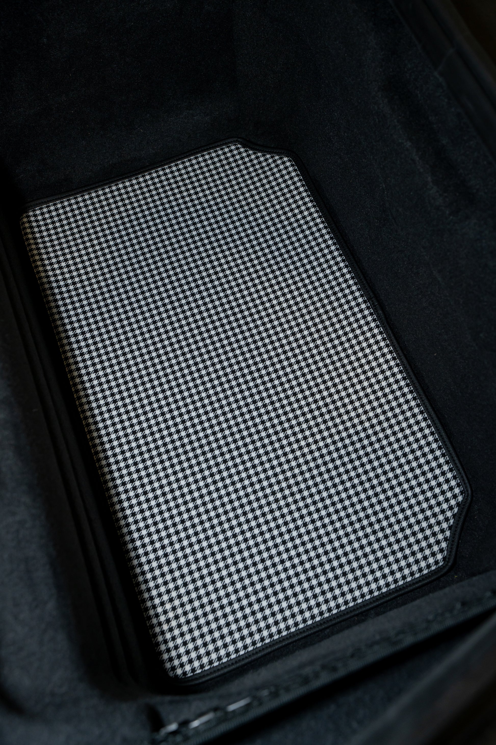 Die passgenaue und hochwertig verarbeitete Matte aus klassischem Pepita wird dir jedes Mal beim Öffnen deines Kofferraums ein Lächeln in dein Gesicht zaubern. Verfügbar für viele Modelle.